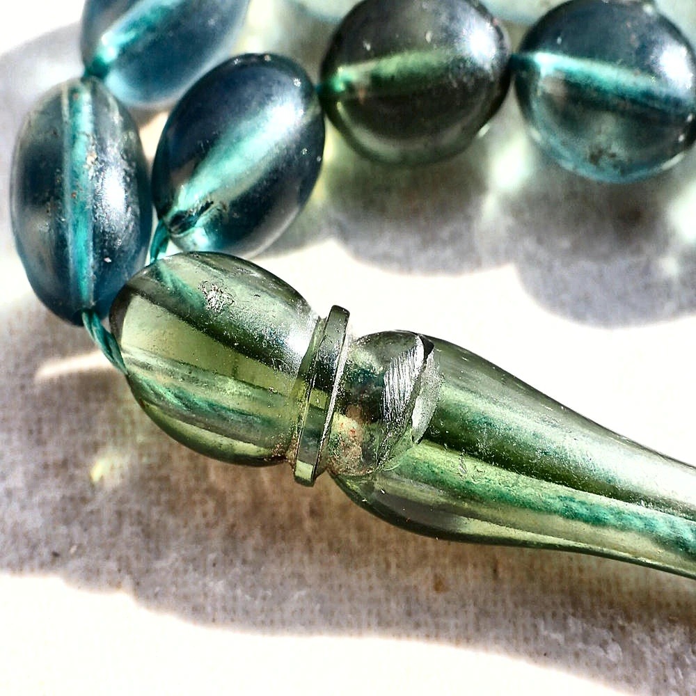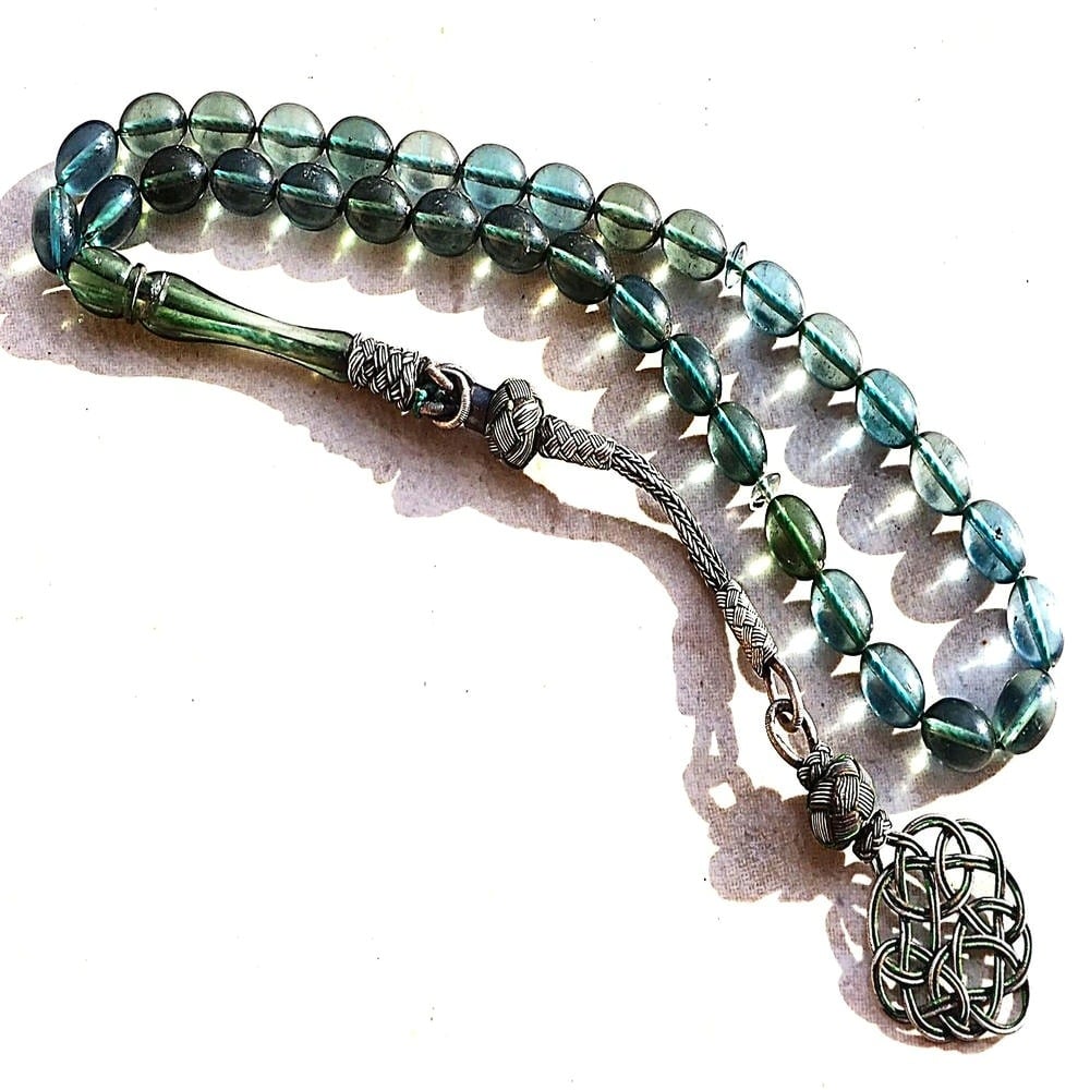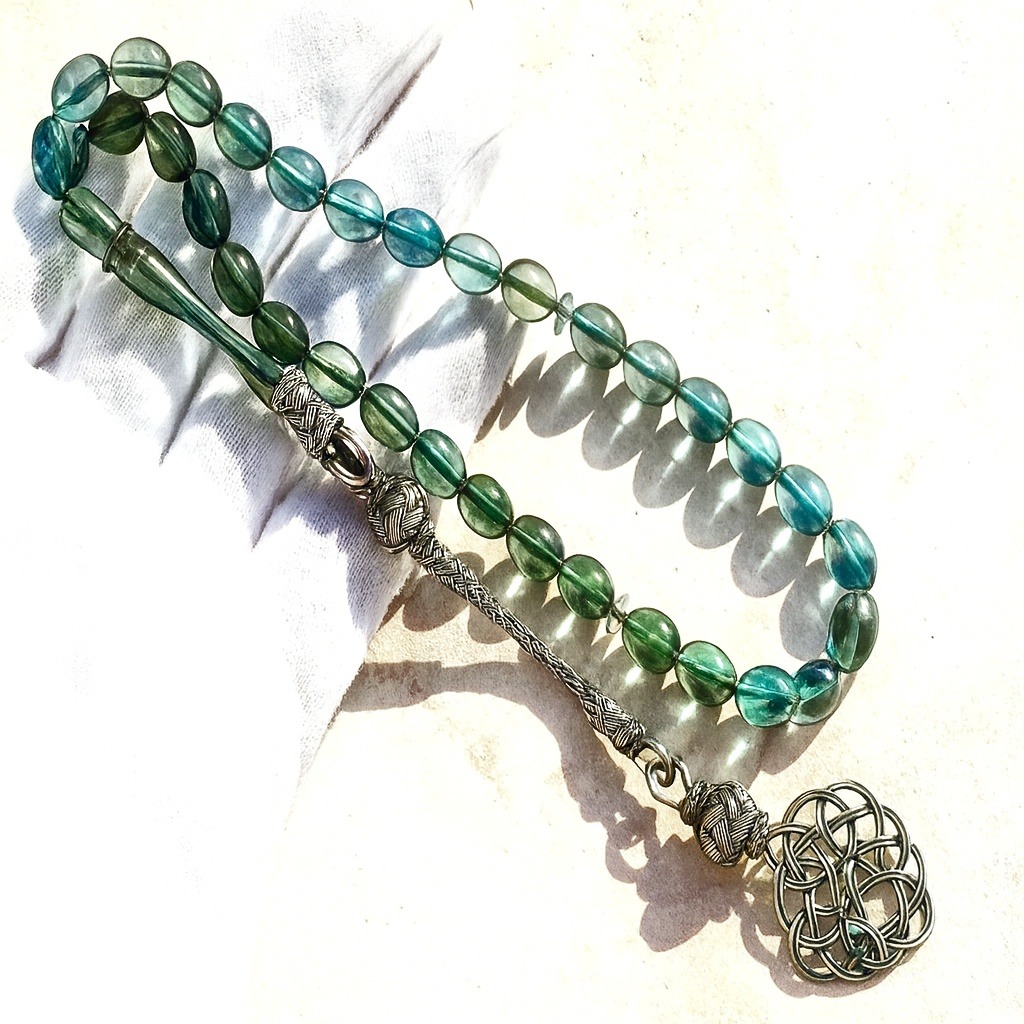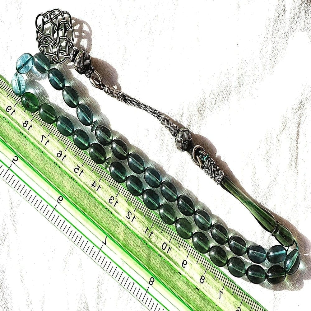 سبحة عثمانية عتيقة بلون أزرق مخضر، مصنوعة بأسلوب عثماني فريد يجمع بين الجمال والزخرفة الدقيقة، تتكون من 33 خرزة بقطر يقارب 8 ملم، مصنوعة من مادة الباكلايت القديمة (Bakelite)، وهي من المواد النادرة في صناعة السبح القديمة، تتميز بلونها الشفاف المتدرج بين الأزرق والأخضر ولمعانها الأنيق، وتكتمل بكركوشة فضة مزخرفة بتصميم عثماني فاخر.