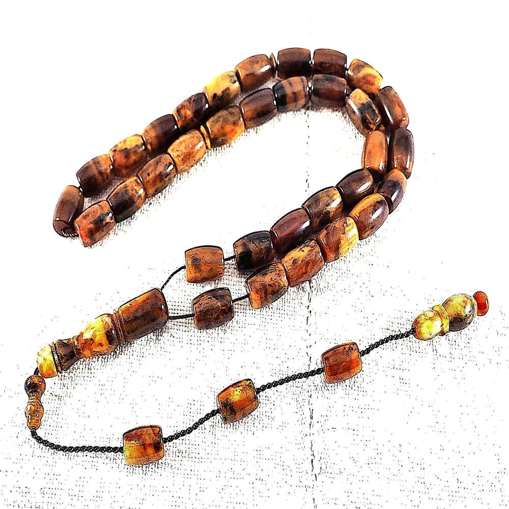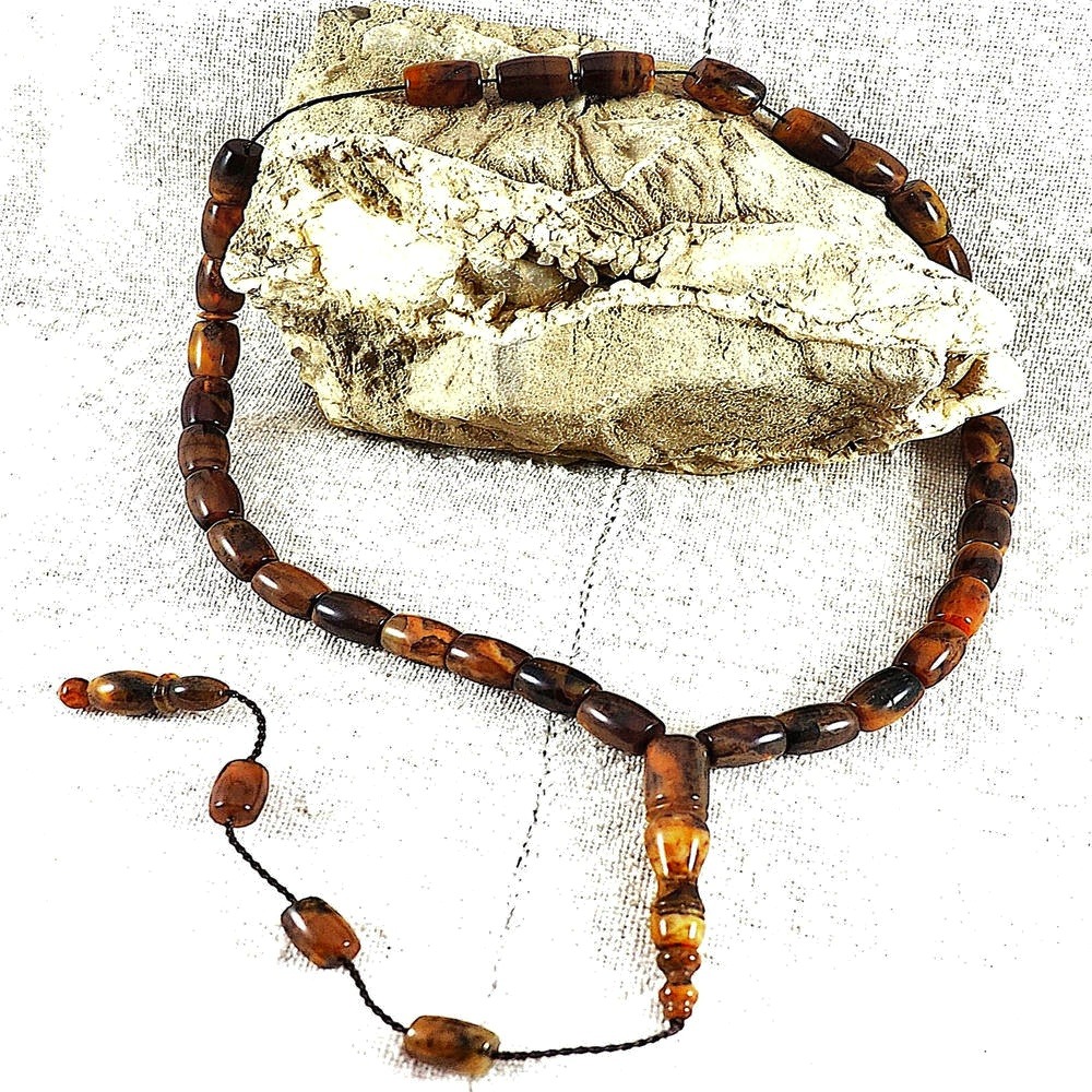 سبحة عربية من الكهرمان وزنها 27.6 غرام، مصنوعة يدويًا من الكهرمان المضغوط الطبيعي، تتألف من 33 خرزة بقطر يقارب 12 ملم، وتتميز بتدرجات لونها البني الداكن والعنبر الذهبي والعسلي التي تمنحها طابعًا فاخرًا وأصيلًا يعكس أناقة السبح الكلاسيكية.