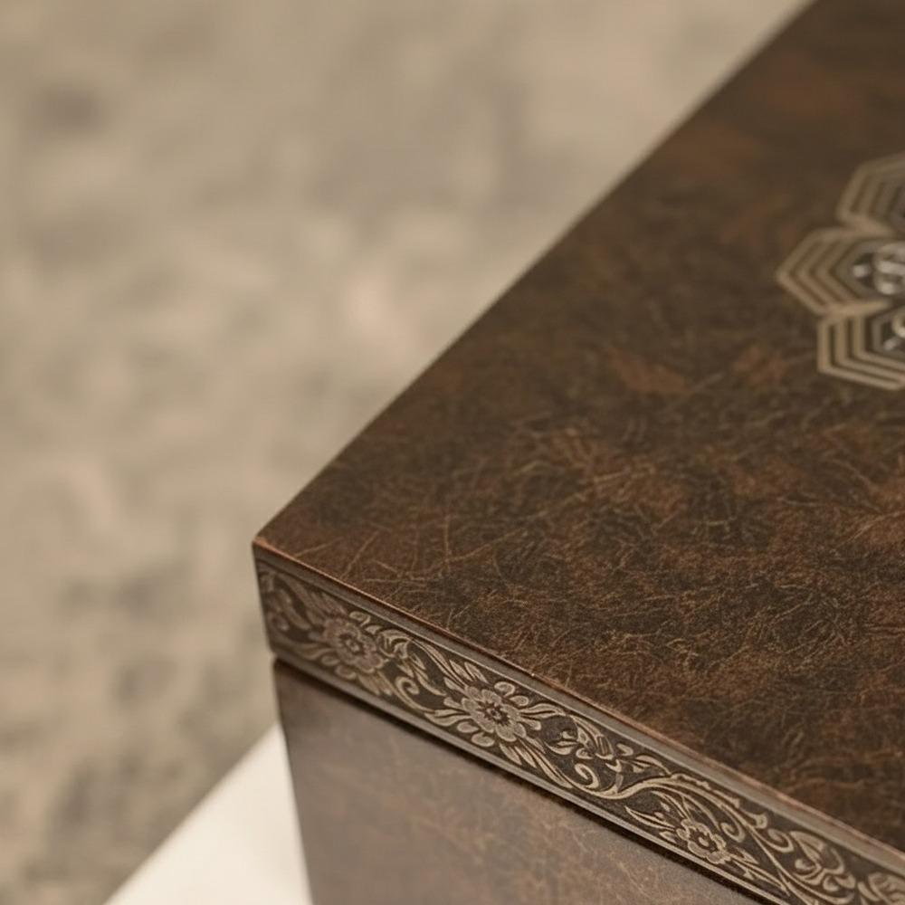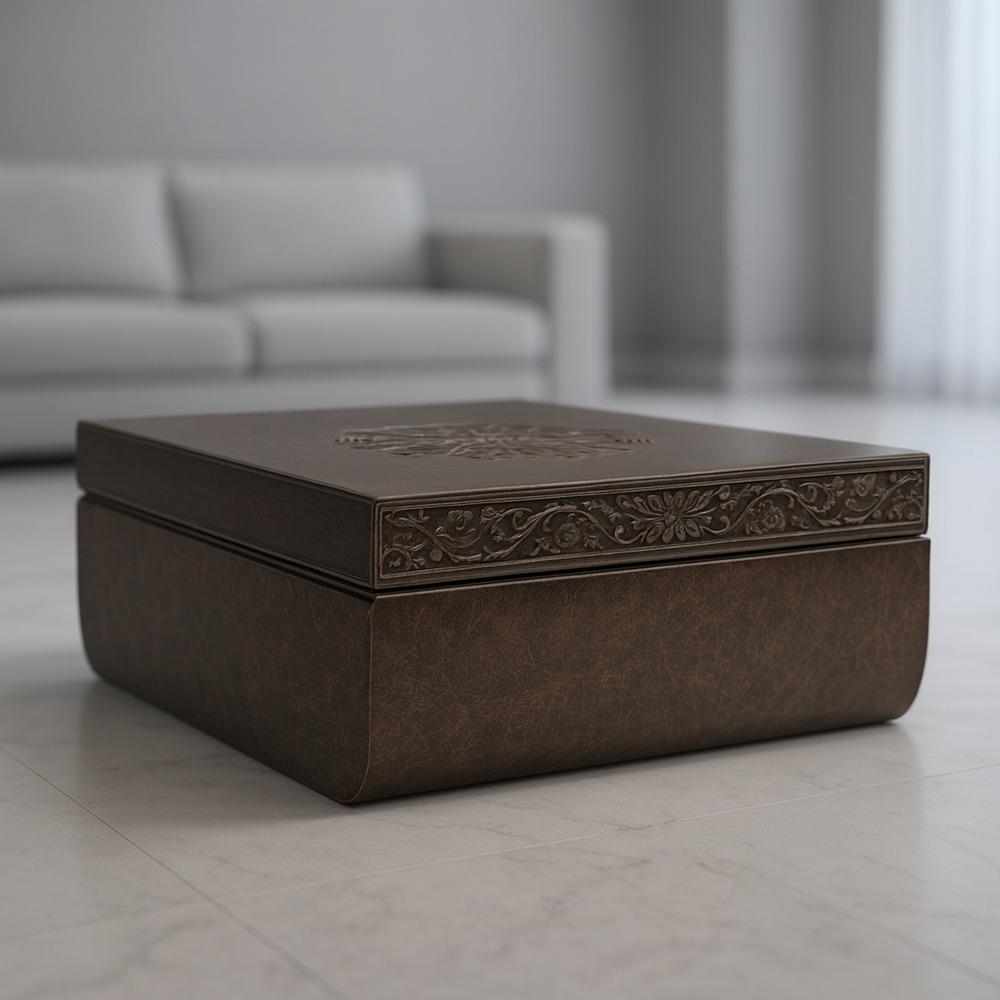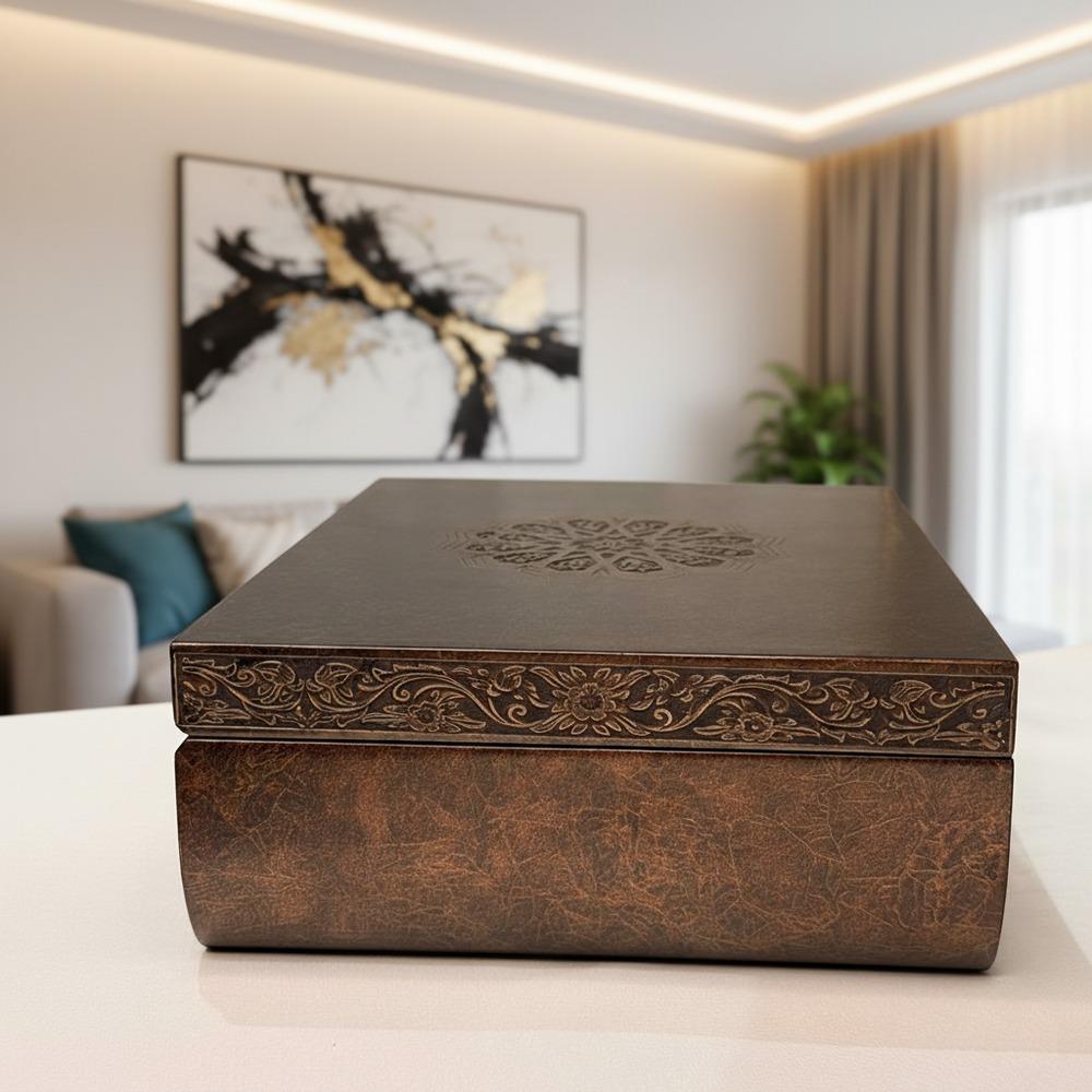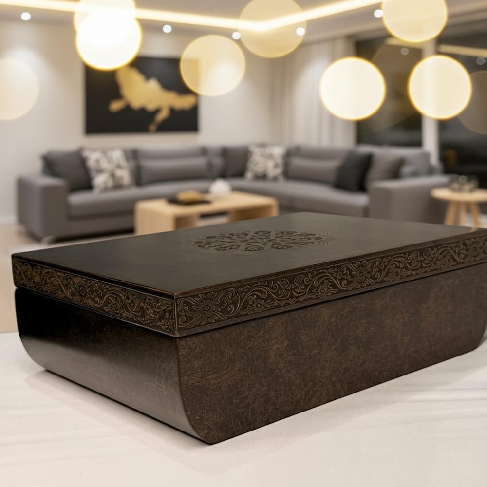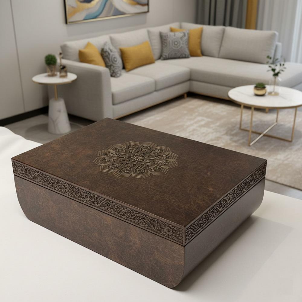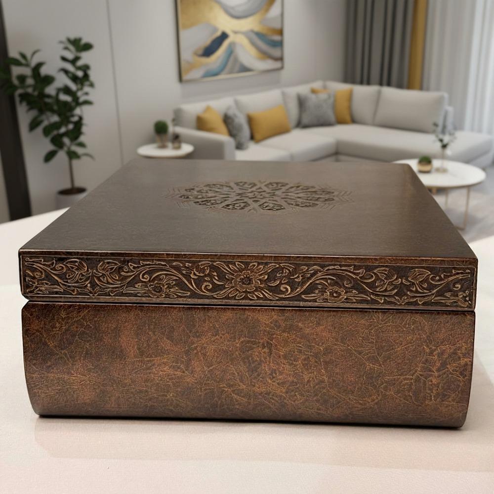 صندوق فاخر بتصميم شرقي راقٍ يجمع بين الفخامة والوظيفة، مصنوع من خشب MDF عالي الجودة مغلف بورق بنقشة خشب فاخرة مع عروق ذهبية، مع نقش وزخرفة دقيقة وتعريق راقٍ، يمنحان مظهرًا استثنائيًا يليق بالمجالس وأماكن الضيافة الرفيعة، يُغلق الصندوق بواسطة مغناطيس قوي يضمن ثبات الإغلاق وسلاسة الاستخدام، يتّسع الصندوق لحفظ ما يصل إلى نصف كيلو من العود (أو أقل حسب نوع العود وكثافته)، ويُعد خيارًا مثاليًا لحفظ العود، كل تفصيل فيه من النقوش الدقيقة إلى الملمس الفاخر يعكس مستوى مختلفًا من الحرفية في الصناعة، والتصميم.